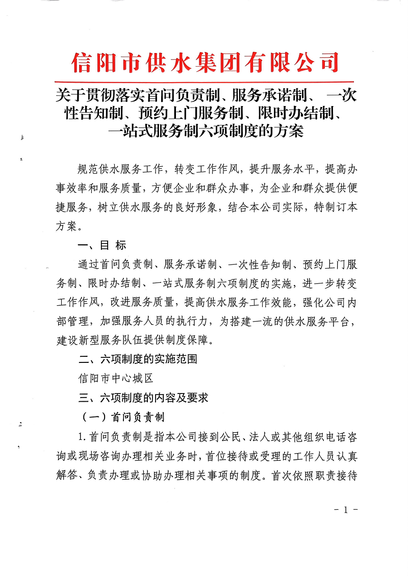關(guān)于貫徹落實(shí)首問(wèn)負(fù)責(zé)制、服務(wù)承諾制、一次性告知制、預(yù)約上門(mén)服務(wù)制、限時(shí)辦結(jié)制、一站式服務(wù)制六項(xiàng)制度的方案