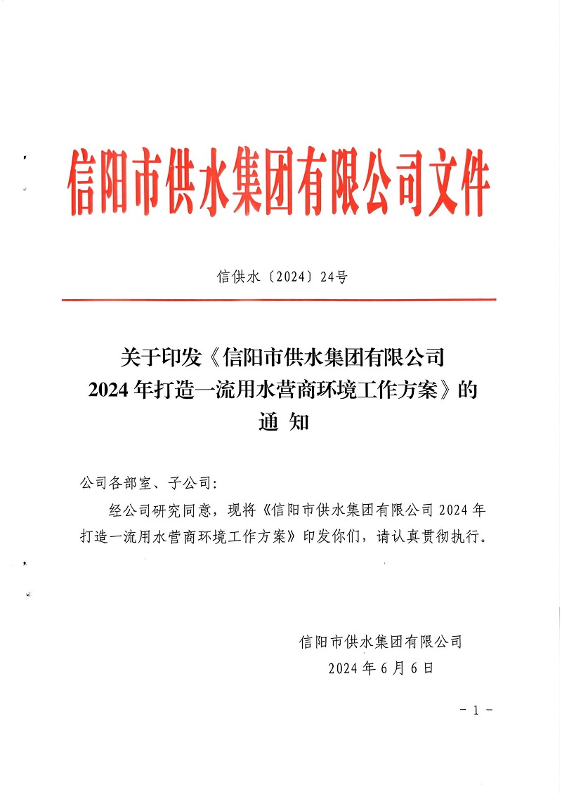 關(guān)于印發(fā)信陽(yáng)市供水集團(tuán)有限公司2024年打造一流用水營(yíng)商環(huán)境工作方案的通知
