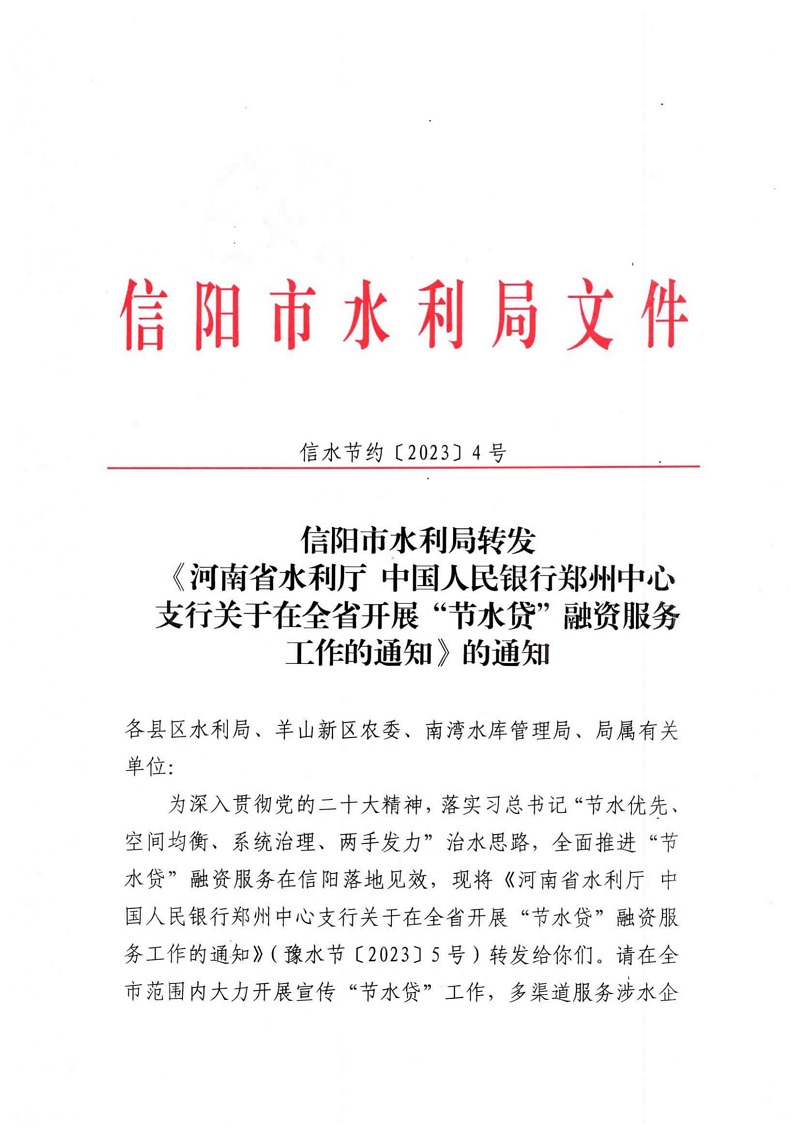 信陽(yáng)市水利局轉(zhuǎn)發(fā)《河南省水利廳 中國(guó)人民銀行鄭州中心支行關(guān)于在全省開(kāi)展“節(jié)水貸”融資服務(wù)工作的通知》的通知